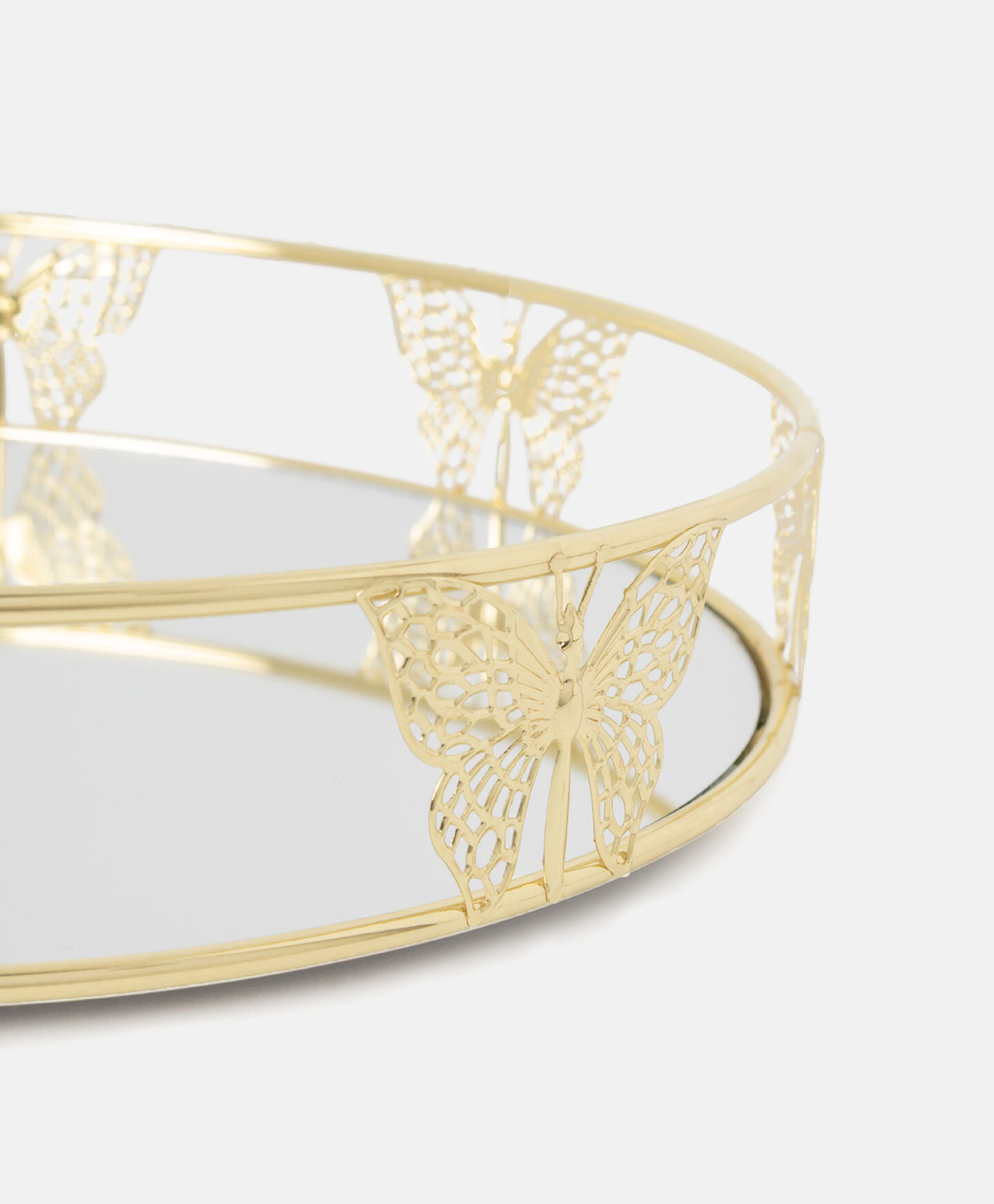 Ukrasni poslužavnik sa ogledalom je moderan dodatak svakom enterijeru. Biće pravi ukras u vašoj dnevnoj, spavaćoj sobi ili kuhinji. Odlično izgleda kao podloga za mirisne sveće i vaze, ali je pogodan i za serviranje pića i slatkiša. Zlatni motiv leptira daje poslužavniku i lagan i elegantan izgled, dok ogledalo prelepo reflektuje svetlost.