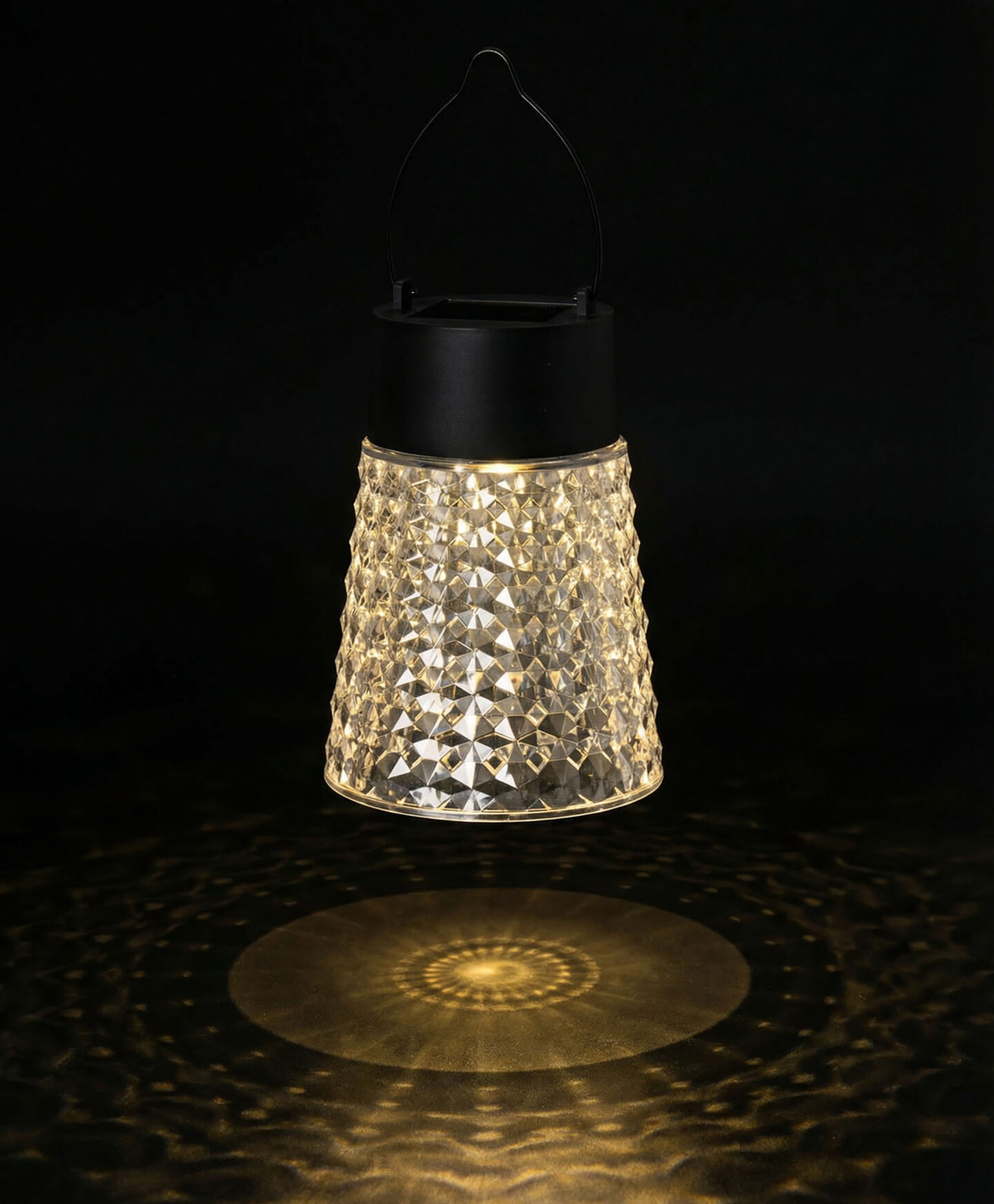 Viseća solarna lampa sa kristalnim abažurom privući će pažnju svakog ljubitelja lepih detalja. Zahvaljujući ugrađenom solarnom panelu, napaja se sunčevom energijom i radi bez kablova i baterija. Abažur od kristala raspršuje svetlost na prelep i umetnički način. Lampa je opremljena praktičnom ručkom koja omogućava kačenje na granu drveta, šipku, ispod plafona ili na poseban stalak. Automatski se uključuje u sumrak i isključuje u zoru, pružajući osvetljenje bez potrebe za održavanjem tokom cele noći.