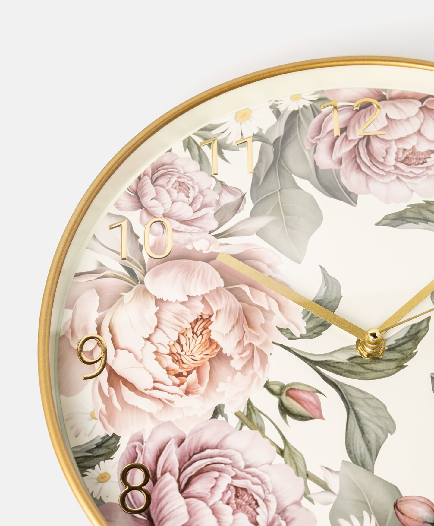 Zidni sat sa cvetnim motivom istovremeno pokazuje vreme i ulepšava vaš enterijer. Motiv rascvetalog božura najavljuje proleće i unosi boje u svaku prostoriju. Zlatni ram i kazaljke izgledaju izuzetno elegantno i moderno. Ovakav sat je odlična ideja za poklon ljubiteljima neobičnih aksesoara.